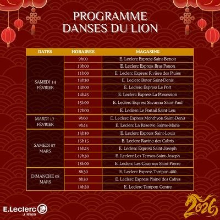 À l’occasion du Nouvel An chinois, les magasins E.Leclerc à La Réunion proposent des danses du lion dans plusieurs communes de l’île.