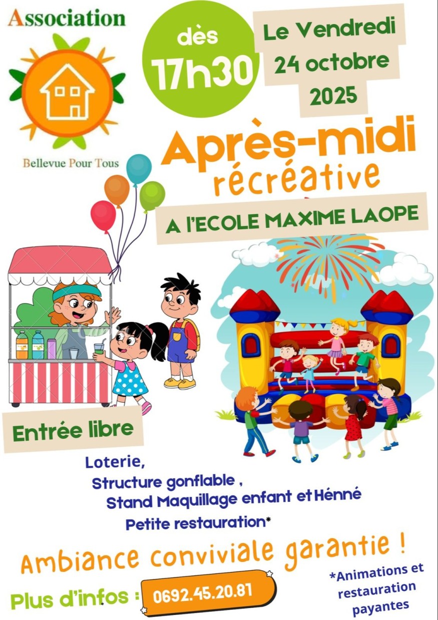 Rejoignez-nous pour un après-midi amusant à l'Après-midi Récréative le vendredi 24 octobre 2025, dès 17h30 à l'École Maxime Laope !