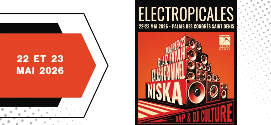 Les 22 & 23 mai 2026 ELECTROPICALES RAP & DJ CULTURE débarque au Parc des Expositions de Saint-Denis de la NORDEV avec sa programmation massive : NISKA le vendredi, KALASH CRIMINEL qui célèbre les 10 ans de R.A.S et BLAIZ FAYAH le samedi, et bien d’autres artistes au rendez-vous !